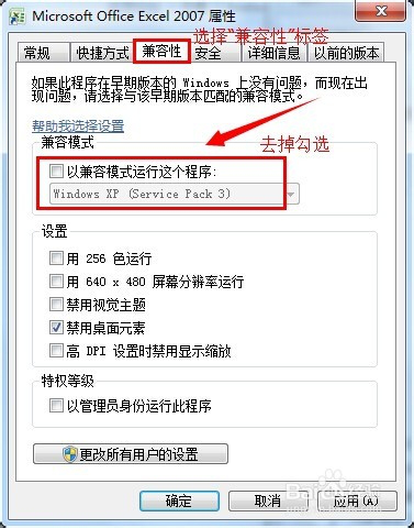 2.之后,彈出word/excel的屬性頁(如下圖)。然后切換到標簽“兼容性”下。去掉勾選“以兼容模式運行這個程序”。之后,點擊“應用”或者“確定”。