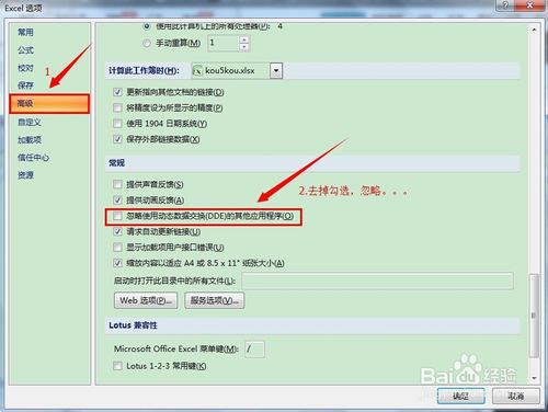 之后會進入到Excel選項/Word選項中。在當前窗口左側選擇高級標簽,對應的在窗口的右邊將“忽略使用動態數據交換(DDE)的其它應用程序”的勾去掉。
