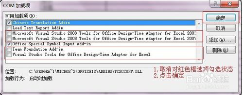 6最后,取消“visual.....for Excel 2003”以及“visual.....for Excel 2007”的勾選(如下圖),然后點擊”確定“即可。
