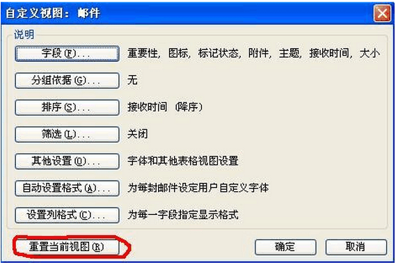2、在彈出框中,選擇“重置當前視圖” 注意:此方法同樣適用于收件箱及已發送郵件列表